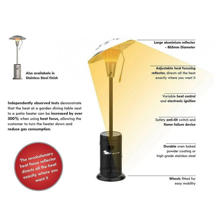 - Sahara Heat Focus allows the customer to adjust the reflector and direct the heat where it’s needed